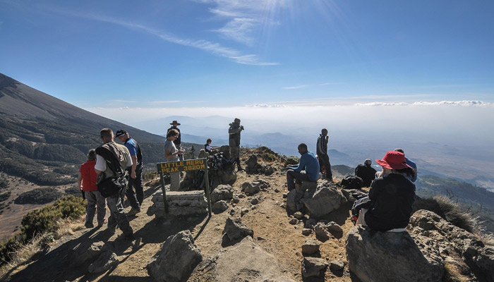 We start early at around 1:30 a.m. to climb steeply to Rhino Point (3,800 m.) and on to Cobra Point (4350m). We reach the summit (4,566 m) for sunrise there is a possibility to see Kilimanjaro Peak above the clouds. The final part of the climb is along a spectacular narrow ridgeline between the sheer inner cliffs and the sloping outer wall of the crater. We take a short rest and brunch at Saddle Hut before continuing the descent to the Momella gate. The returning transfer will be waiting at Momella Gate to pick you to your hotel in Arusha/Moshi.